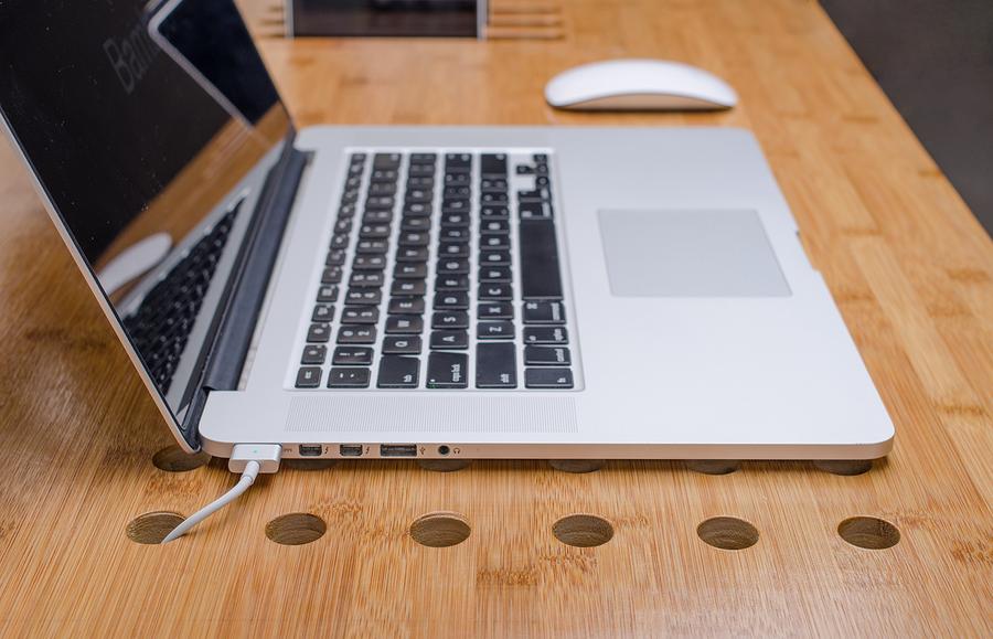 桌面的尺寸為1200m(長)X600mm(寬)X2mm(厚),高度為75cm高。這個經典尺寸的好處是,雙手正好可以觸及到桌面的每一個位置。此款桌子與其他桌子的不同點就是桌面的收納部位都采用了類似手機App圖標的正方形設計,而且和手機一樣,這些圖標在桌面上都可以隨意替換擺放。桌面左右方都設計了一個28cm(長)X12cm(寬)X10cm(高)的收納盒,對于筆記本用戶來說,桌面的中間位置有專門的散熱孔,比如對于類似于MacBook這種無外散熱的設備來說,能起到降溫效果。