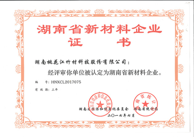 2017年7月,湖南省經(jīng)濟(jì)和信息化委員會(huì)、湖南省統(tǒng)計(jì)局為湖南桃花江竹材科技股份有限公司正式頒發(fā)“湖南省新材料企業(yè)”證書(證書編號:HNXCL2017075)。湖南省新材料企業(yè)的認(rèn)定,標(biāo)志著湖南桃花江竹材科技在新型竹材領(lǐng)域的成績得到國家認(rèn)可與支持,是一項(xiàng)具有含金量的突破性榮譽(yù)。作為中國竹業(yè)龍頭企業(yè),湖南桃花江竹材科技一直走在新型竹材研發(fā)、運(yùn)用和推廣的前沿,為全球竹產(chǎn)業(yè)的發(fā)展持續(xù)貢獻(xiàn)力量。