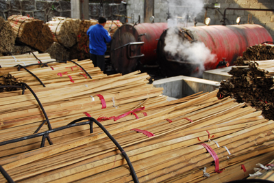 蒸煮碳化,將去掉竹片中的營養成分,使得制造成的竹板材產品質地更加緊密結實,并且不防蟲防蛀。